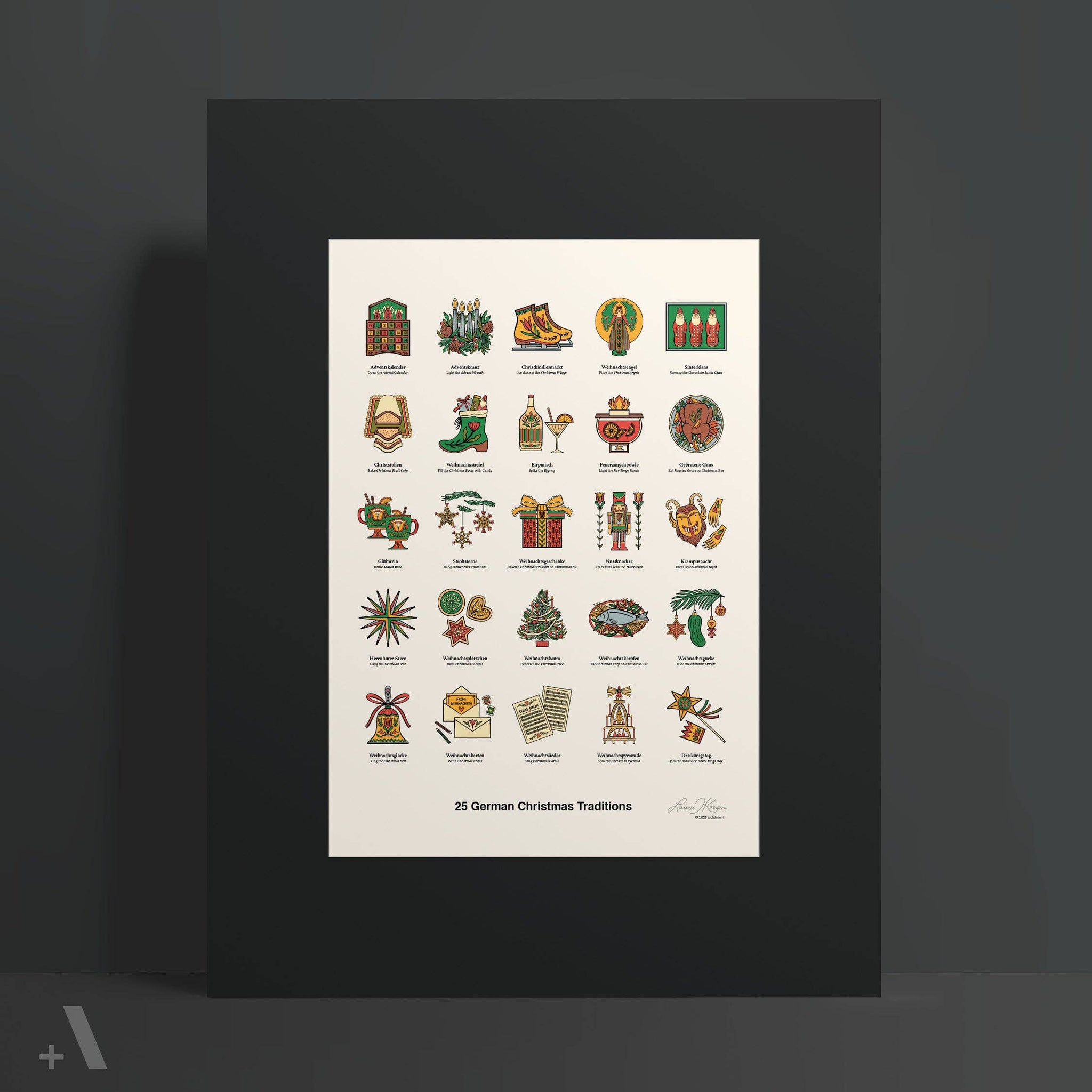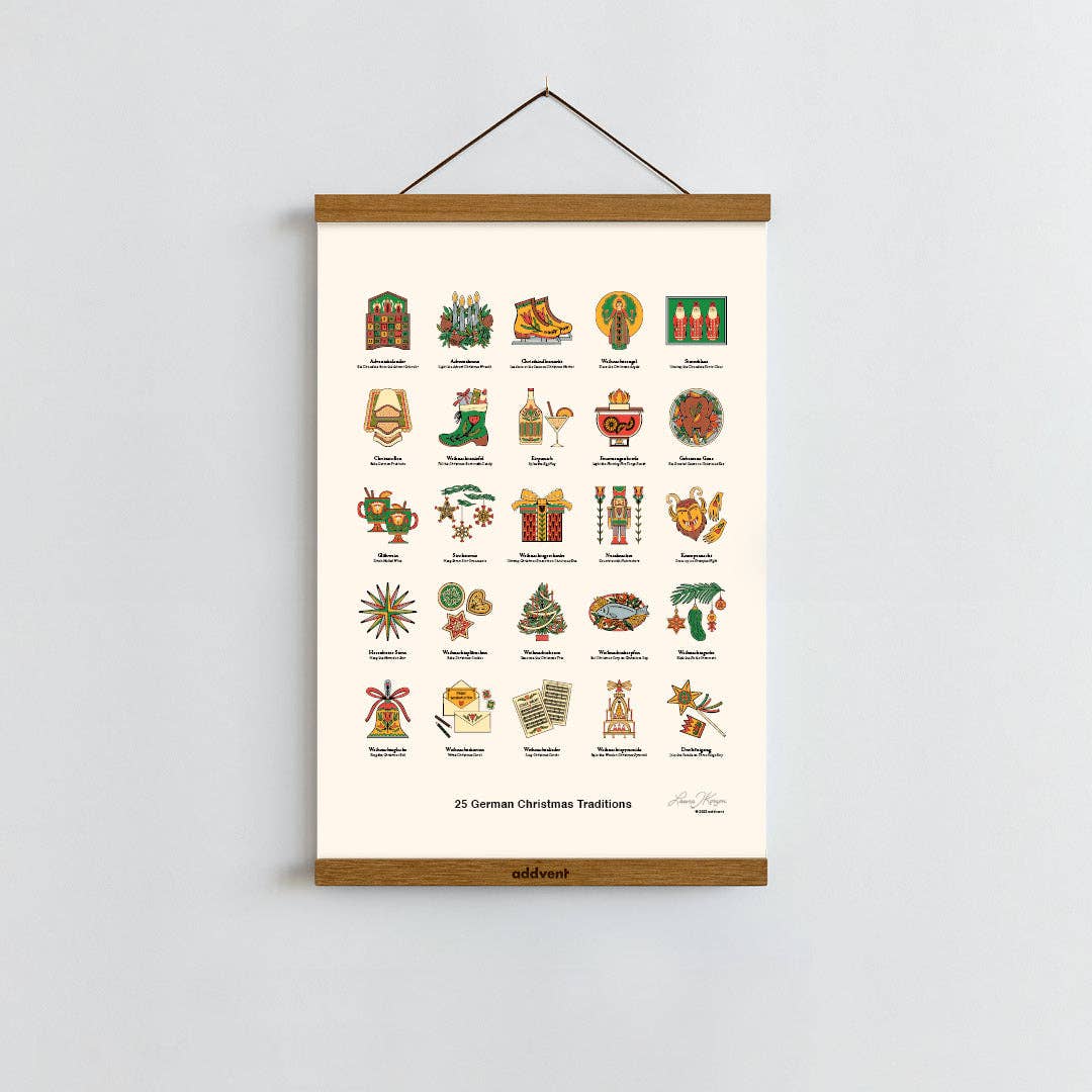 This Poster Features 25 German Christmas Traditions: Adventskalender (Advent Calendar) Adventkranz (Advent Wreath) Christkindlesmarkt (Christmas Market) Weihnachtsengel (Christmas Angel) Sinterklaas (Santa Clause) Christstollen (Christmas Fruit Cake) Weihnachtsstiefel (Christmas Boots) Eirpunsch (Eggnog) Feuerzangenbowle (Fire Tongs Punch) Gebratene Gans (Roasted Goose) Glühwein (Mulled Wine) Strohsterne (Straw Star) Weihnachtsgeschenke (Christmas Present) Nussknacker (Nutcracker) Krampusnacht (Krampus Night) Herrnhuter (Stern Moravian Star) Weihnachtsplätzchen (Christmas Cookie) Weihnachtsbaum (Christmas Tree) Weihnachtskarpfen (Christmas Carp) Weihnachtsgurke (Christmas Pickle) Weihnachtsglocke (Christmas Bell) Standard Size | 12x18 (Arch B)
