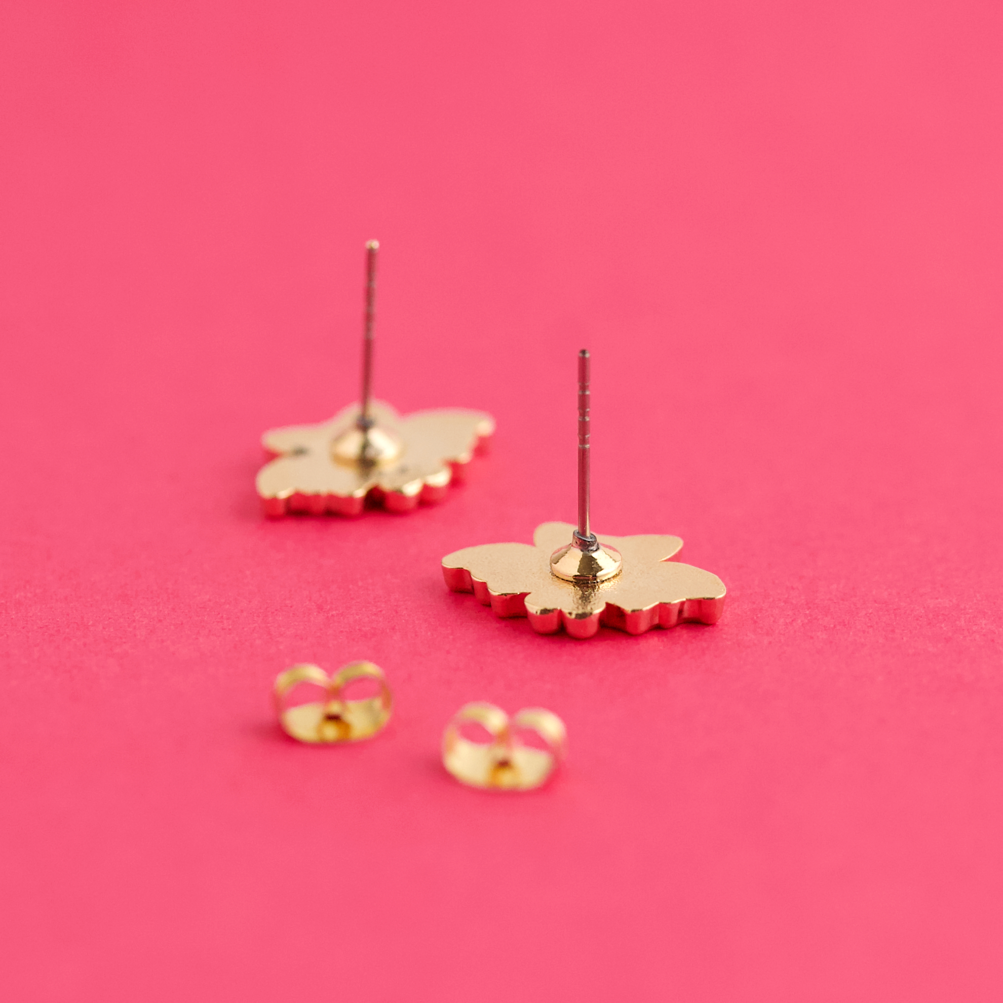 All 0.5'' enamel earrings are plated in 22k gold with stainless steel posts. Individually packaged in protective hanging cello sleeves.