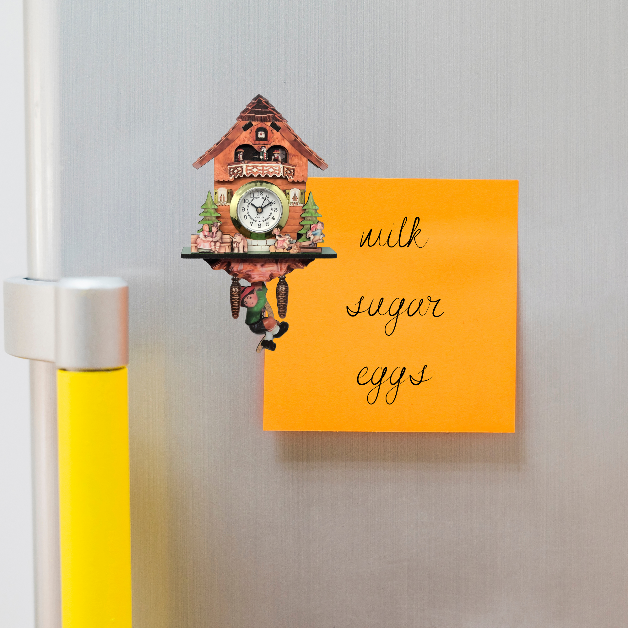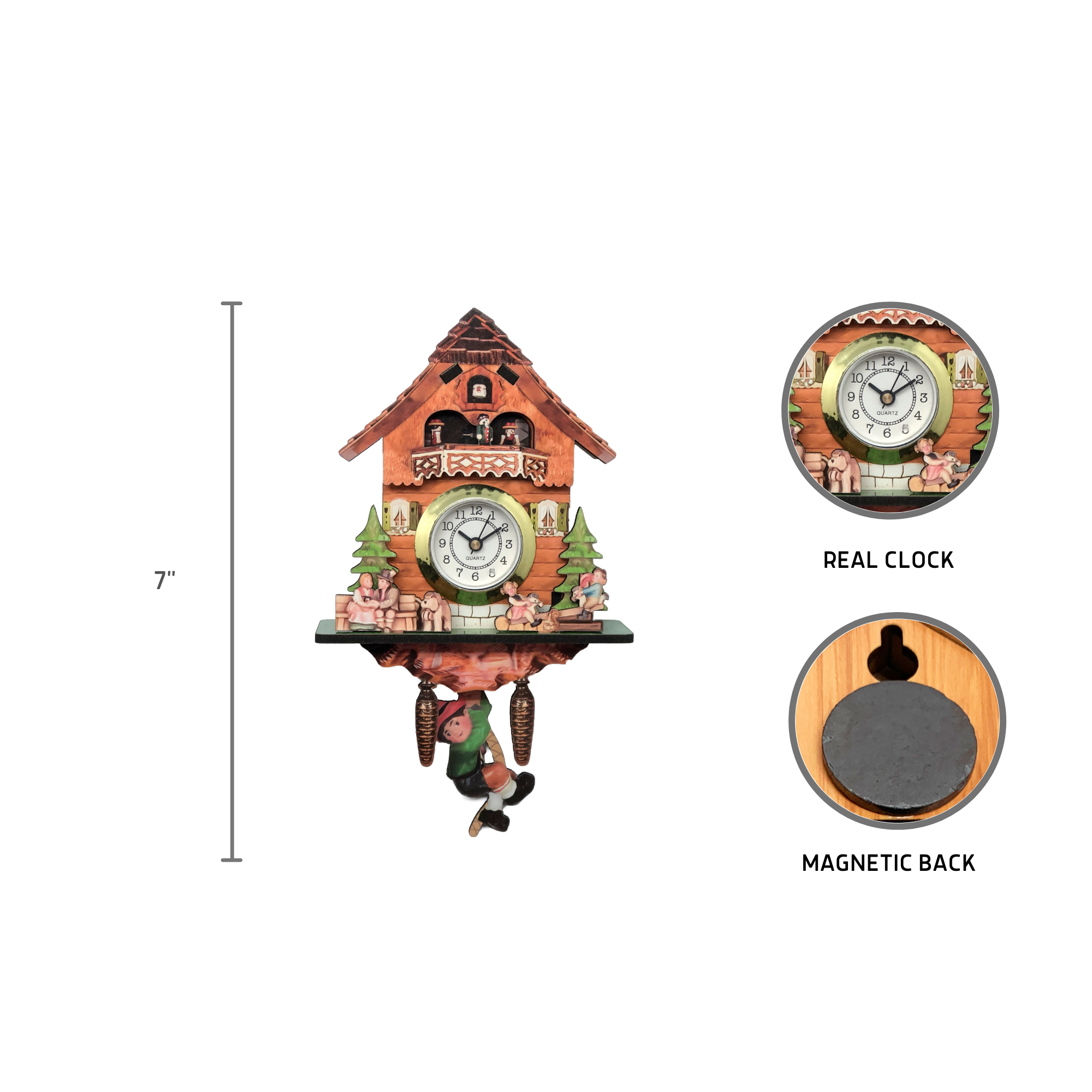 This charming kitchen magnet made of a wood composite features a highly detailed cuckoo clock motif along with a theme of Edelweiss, a Saint Bernard dog, cow and swinging German boy theme within a 3-D dimensional effect making for a unique kitchen magnet. An additional special feature of this great German themed kitchen magnet is that there is a real functioning clock installed in the magnet!